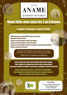 En juin, partis à la recherche d’un restaurant où fêter les 10 ans de l’association, nous avons fait la connaissance de l’Aname, jeune bistrot vietnamien du 17ème arrondissement. La fête qui s’y est déroulée sera un très beau souvenir de cette année Ce fut aussi une belle rencontre avec l’équipe de l’Aname qui, enthousiasmée par nos projets, nous a proposé d’organiser des événements dont une partie des bénéfices nous serait reversée. A l’occasion de la célébration de leur première année d’ouverture au mois de septembre, nous avons ainsi reçu 500€.